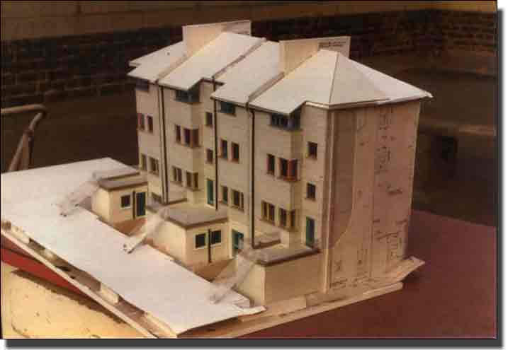 The backs of the other blocks are different as we shall see. This model shows the new rear walls and the new, low-level back additions with small patios on the roofs and steps down to the gardens. Notice the front steps from the front garden level to the basements at this end of the model. The rear garden too is raised, emphasising that the houses were first built by digging out basements into the gravel soil. Because the soil was gravel, rain would soak away and the basements would be dry. These basement houses, contrast with houses north of Stoke Newington Church Street, where the soil is London Clay and any basements would fill with water like swimming pools. North of Church Street most of the houses have no basements that can be lived but and only damp coal cellars. Almost everything seen in this view of the model was to be newly built. The old back walls would be demolished and then the backs would be completely rebuilt, with new bricks and modern Swedish windows instead of thetraditional sash windows. On the end of the model, the architect has pasted his working drawing to show the new flats inside. Notice the rear roof extends in one sweep over the shallow back extensions to save the complication of small extra roofs. They are really short catslide roofs.