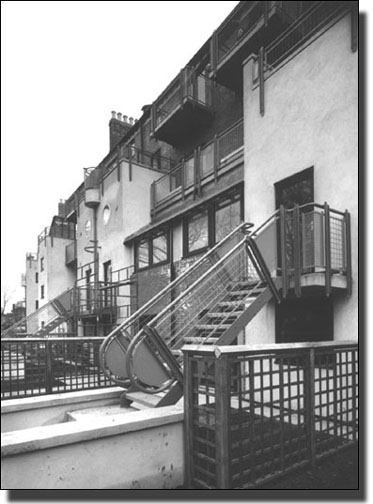 This block has been rebuilt while Nos. 1-7 on the right has had its back walls removed and the floors are held up on steel jacks. The gardens have been separated by a narrow access passage which led to the central plot of land on which Betty Layward School has now been built. The back elevations of Nos. 9-15, on the left, have been rebuilt and one can see the different ways in which the flats have been redesigned. Notice that the centre back additions are higher than the outside ones. The four back additions have been rebuilt, rendered in stucco and painted white. The windows vary from floor to floor and point in different directions There are two oculus (round )- (eye) windows in the central back additions. All the top flats have balconies. The second floor flats have balconies. French doors lead out to small patios on the tops of some back additions but it is not clear if these patios belong to the second or third floor flats. The first and second floor flats have long balconies but one has been glassed in as a conservatory. The ground floor flats open out into small fenced gardens. Wherever possible the trees have been retained. On the right, the back walls of Nos. 1-7 have been completely removed and the floors are being held up on steel jacks. This means that the flats were uninhabitable at this time so the tenants must have been moved into other, temporary accommodation. There had to be a good deal of this sort of movement to fit in with the rebuilding. The next pictures show details of the backs of the rebuilt blocks 1-7 and 9-15. Here they have metal staircases leading to the rear gardens and wooden trellis work to separate the flats.