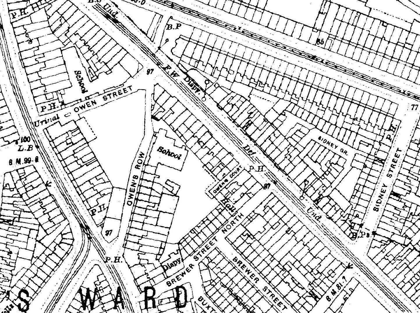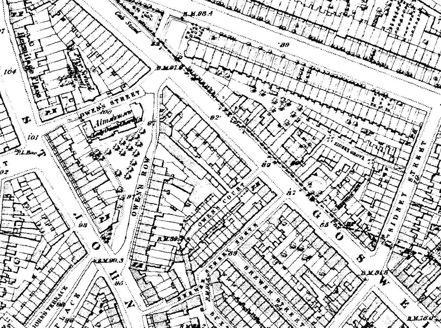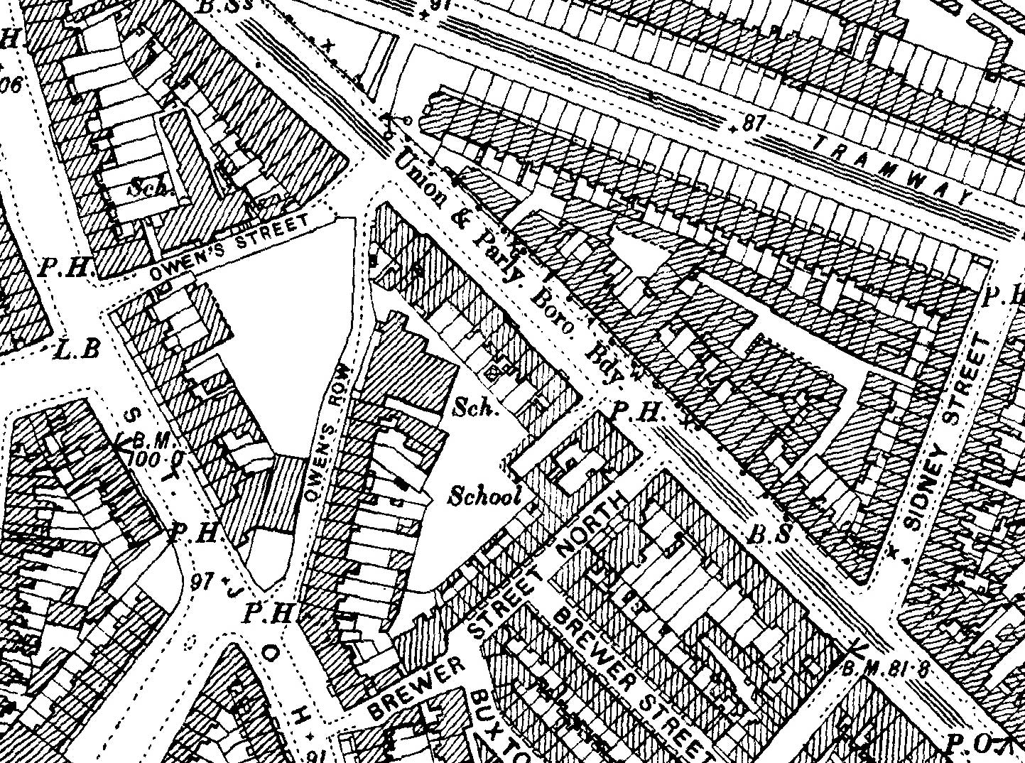 The Owen’s Boys School first appears in the 1896 OS Map. By 1955 the old school had been demolished and a new Boys School |
