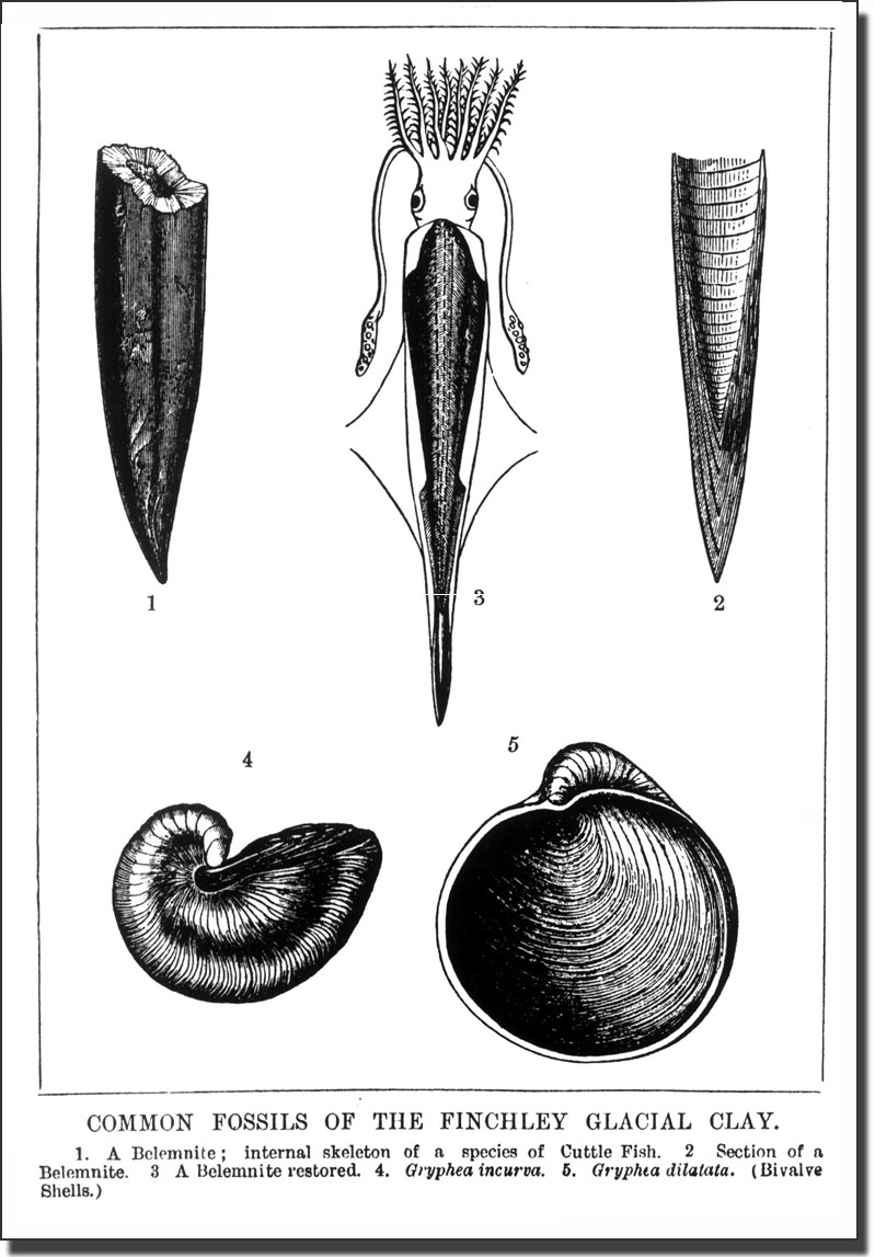 Mr Wetherell was a medical practitioner living at the crest of West Hill, Highgate. He had examined every railway cutting or other digging in the area. He had found these strange deposits not only in Coldfall Wood, but all over the district. There were Belemnites, which were fossils of cuttlefish skeletons, and Devil's Toenails, which was the country name for fossils of the snail Gryphia. He had found stone from Scotland, Lincolnshire, and even Scandinavia, all carried here in jackets of ice and deposited as huge layers of Boulder Clay when the ice melted.