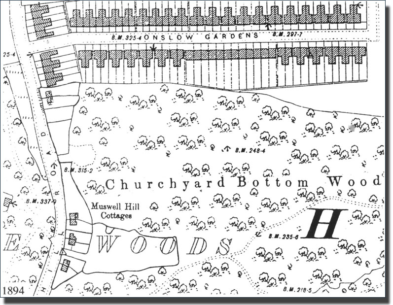 At that time Muswell Hill Road was a country road, with Southwood Hall at one end and Upton Farm at the other. By 1894, Onslow Gardens was built, Connaught Gardens was marked out, and builders were poised to develop the Woodlands estate. Cut out of Churchyard Bottom Wood was a group of tumble-down cottages, on a triangular site. An undated map, held by the Ecclesiastical Commissioners, shows six Wasteland Cottages with an opening between them -- not a road, not metalled, but a way through to the strawberry beds behind. Further along was another gap which led to footpaths through the wood. These two openings were to be the basis of the plan. The same two gaps and the cleared ground, which was the strawberry field, can be seen in the 1894 map below. They are shown as 'Muswell Hill Cottages' and, quite in passing, Peter Sellers was to live on the same site much later on. To develop the wood as a housing estate, the Commissioners needed to drive two roads through from Muswell Hill Road and build houses along them. The Muswell Hill Road frontage alone would not have provided room for enough houses to make the venture worthwhile. Much earlier the land and cottages had been given as almshouses to house old people and were held on their behalf by the Trustees of the Hornsey Charity Commissioners. By the 1890s the cottages were tumble-down and in need of major repair. Public-spirited, wishing to do the best for their old tenants, the Trustees could not improve them since they had no money. Some years before the Ecclesiastical Commissioners had planned to develop Gravel Pit Wood (now Highgate Wood) as a housing estate, but this had met such opposition that they backed down. Instead, in 1886, they gave all 69 acres of woodland to the public. At the same time they offered to sell Churchyard Bottom Wood to Hornsey Urban District Council for £25,000, but this was too much for Hornsey to raise on its own. The Council said that people living outside Hornsey also enjoyed the wood and other authories should help, but no help was given. In the end the offer fell into abeyance.