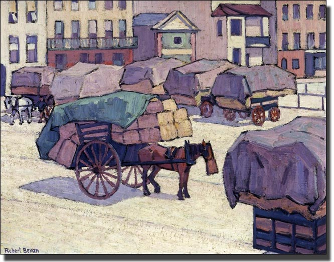 Industry Colonises the Banks of the CanalIn 1990 Westway and Harrow Road rush past the site, carrying passengers and goods, while North Wharf Road was a rather a sleepy side road. A hundred years ago Harrow Road was a twisting carriage road passing through Paddington Green and carrying mainly local goods. Most long-distance goods traffic and many travellers were carried by the canal and North Wharf Road was a busy mass of horse drawn carts. Bevan's painting of hay carts in Cumberland Market, by the Zoo, which used to be the next wharf along, but has now been filled in, gives some impression. This is rather a peaceful picture of a backwater where hay was the major freight. North and South Wharves were much more grimy and workaday. The canals would never give a picture of bustle but they were full of activity.