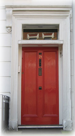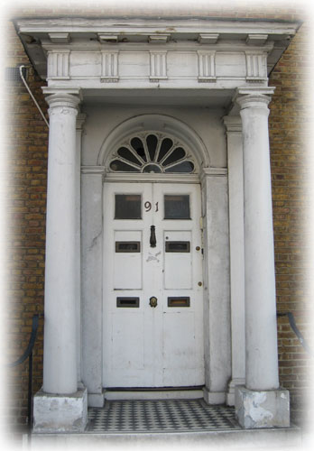 This is another doorway, of a slightly later period, with a rectangular fanlight above the door. The curious blocks in the fanlight glass are reflections of the tops of the windows in the houses opposite. The elaborate cast iron or wrought iron security panel in the fanlight has gone, but the opening is now too narrow for anyone to squeeze through. Security has been preserved. The porch has been reduced to a token moulding on small Gibbs brackets and there is a narrow Egyptian key pattern above the door. Everything has been simplified. The ground floor and basement walls have been rendered in stucco, with the stucco lined to imitate stone. No doubt, if the stucco was removed, it would reveal cheap bricks made from local clay, instead of the London Stocks which were used above. These contained chalk, were made in the Thames Estuary and were far more expensive. It must have been cheaper for the builder to render with stucco than to build entirely in London Stocks. Looking at this house one can see a builder determined to create an attractive, efficient house, but keeping his costs down. |