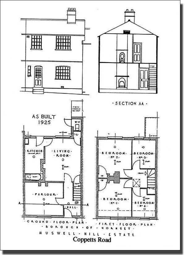 Homes For HerosDuring the First World War there was Compulsory Service for all men from the age of eighteen. This revealed that vast numbers were undersized and malnourished. They had been underfed and lived in bad housing all their lives, but this was the first real review of public health across the nation. It shocked everyone and Lloyd George, who could pluck a popular slogan from the air, promised 'Homes For Heroes'. The returning soldiers would have decent houses to live in and, after 1924 and the Labour Wheatley Act, these began to appear. Again, the need was greater in other parts of London than in Stoke Newington and no 'Homes For Heroes' houses were built here. Elsewhere in London the housing need was more urgent and different solutions were found to the common problem. Where there was open space, in for example, Muswell Hill and Tottenham, they built cottage estates, with long gardens. In old built up areas like Hoxton, old properties were demolished and five-storey blocks of flats built on the sites. No blocks were built in Stoke Newington at this period, but some Stoke Newington people were re-housed in the new London County Council flats at White Hart Lane. Building "Homes for Heroes" in CitiesThese two examples show how councils tackled the problem in towns and in the countryside. From The Growth of St Marylebone and Paddington, by Jack Whitehead. Building "Homes for Heroes" in the CountryIn Muswell Hill, where there were still fields and woods, some of the thousand year old Middlesex Forest was cut down and a large estate of cottages with big gardens was built.