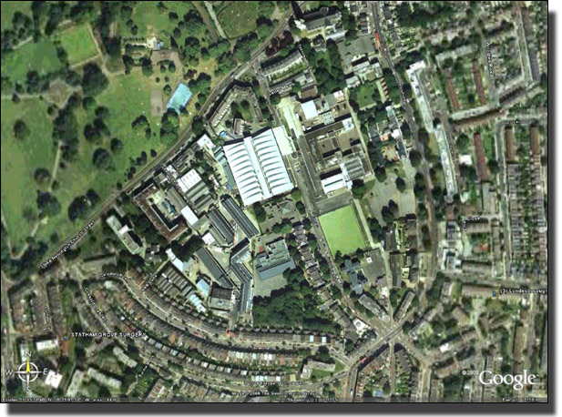 The Aerial Site Map of Stoke Newington School and Betty Layward School sites. The Swimming Bath and Football Pitch show up clearly. Betty Layward School is blue/greyin colour, with the wood backing on to Carysfort Road.