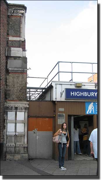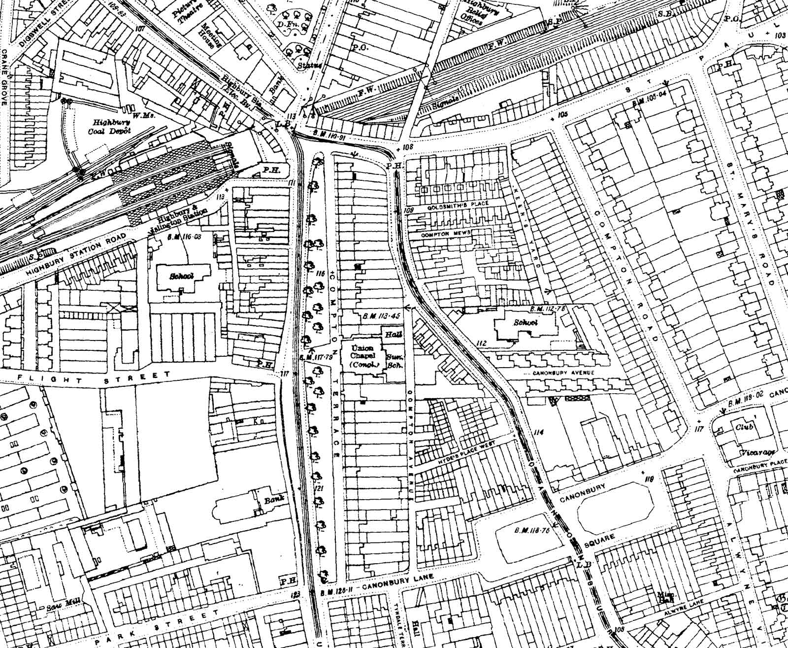 1914 Ordnance Survey map of Highbury Corner The map shows Highbury and Islington Station before it was bombed The reason for the change is easy to find. Railway junctions were prime targets during the Second World War and, as the lines were easy to see from the air, they were all attacked. The Bombing map shows widespread damage in nearby streets. Goldsmith Place , one of the cul-de-sacs off Compton Road , and the school itself; suffered blast damage. The end of St Paul 's Road was hit, but the greatest damage happened on the night of 27/28 June, 1944. A V2 rocket fell outside the Post Office, destroying the end of Compton Terrace and the Railway Station. 24 people were killed 116 seriously wounded. The station, was destroyed, leaving only a solitary pilaster which is still to be found in the wall out side the new booking Hall. The end houses in Compton Terrace were destroyed and nearby ones so badly damaged as to be beyond repair. V2 rockets were almost random weapons, which could not be aimed at particular targets so, despite earlier attempts to destroy the station and disrupt traffic, it was probably just bad luck that the this V2 struck just where it did. The remaining end of Compton Terrace has been preserved and a plague erected on the end wall.