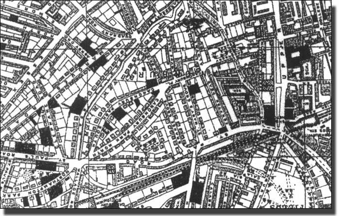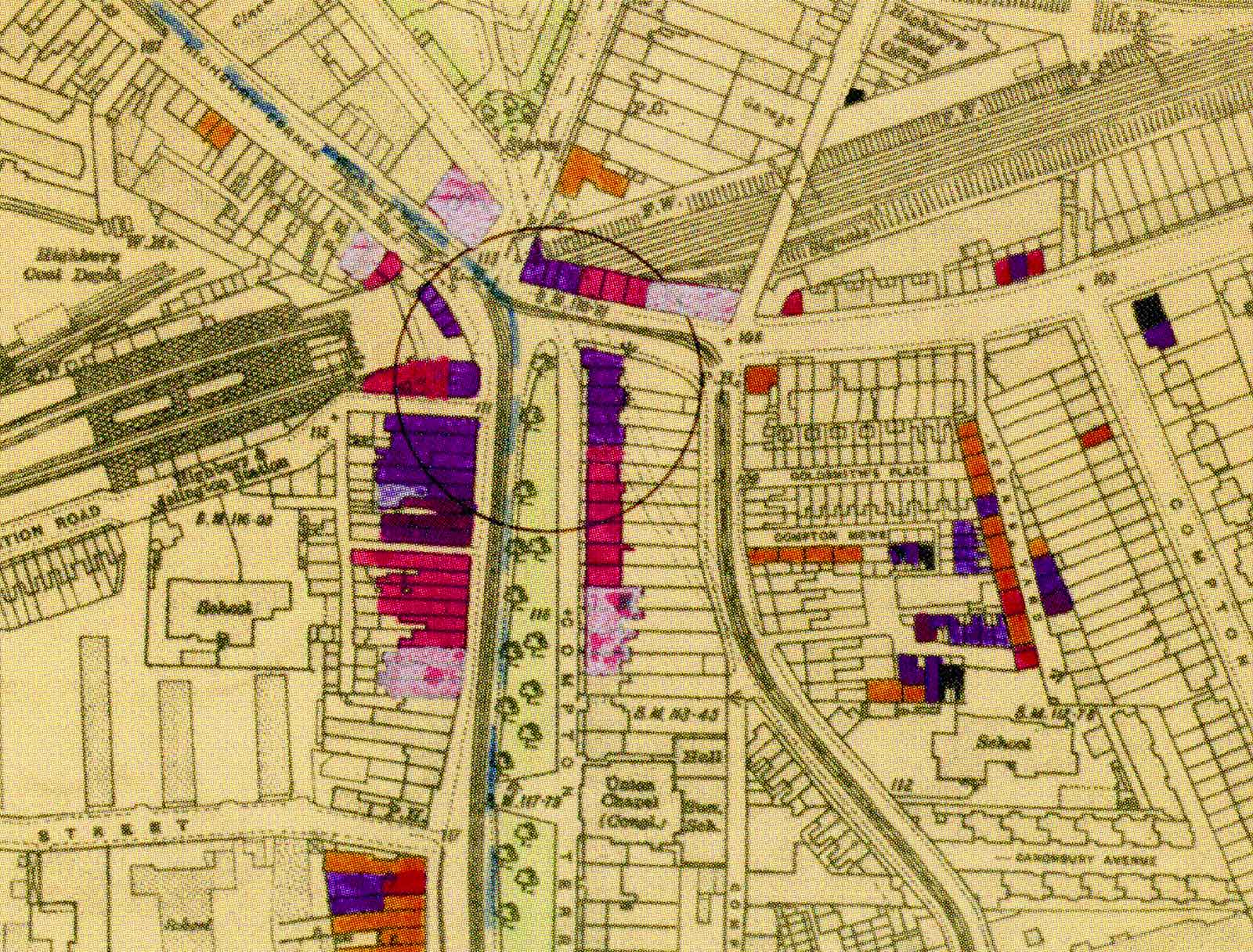 The Bombing Map of Highbury Corner Coloured map detail by kind permission of London Metropolitan Archive.