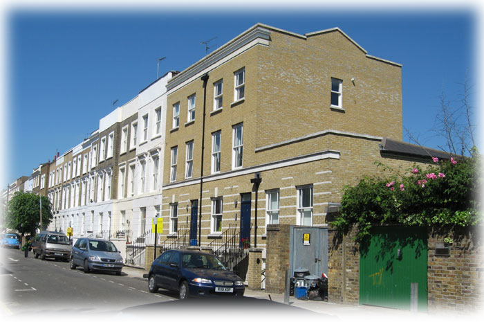 The first eight houses in Albion Grove were built as a terrace, probably by one builder. Pieces have been changed and repaired over the years, though by looking at the whole terrace, one can imagine what it looked like when first built, For example, the pediment shape which is still to be seen on the left hand end, once continued all along the terrace. The window panes are larger the the 1714 Sisters' Houses opposite the Library. By about 1850, when these houses were built, glass makers had learnt how to make larger sheets of glass cheaply. The windows have very fine glazing bars and the window frames are set back behind layer of brick. This was a later requirement of the Building Regulations to make the houses even safer against fire. Only a thin line of frame is visible and this gives an appearance of delicacy to the houses. This terrace is typical of the 1850-60 period, simple, elegant and highly practical. BasementsThere is one more point. These houses have basements. There are not many basements to be found north of Church Street yet these houses have them. Why? The ground south of Church Street has a thick top layer of Gravel, but the area north of Church Street has not. There the ground is solid London Clay. A basement cut in a Gravel soil will drain rapidly and easily, leaving the house dry. A basement cut into London Clay will hold the water and become a swimming pool. This is why you will find only damp coal cellars north of Church Street, not real basements. It is true that today we can build basement level rooms in London Clay but they have to be 'tanked' with asphalt. The complete basement has to be lined with a layer of asphalt and then either rendered over with sand and cement, or an inner wall of brick, to hold the asphalt still.This is very time consuming and extremely expensive. No builder could have sold houses in 1850 with tanked basements, even if he had known how to do it. He would have been bankrupt in a week. Next comes a taller, three-storey house with a higher basement and front door. This was probably built by a different builder. He (there were very few women architects and builders at this time) had the good architectural manners to make his top storey line up with the pediment of the terrace next door. It dos not break the line of the terrace too badly. Some houses in the road have pediments. Others have roofs which project slightly. These have small eaves supported on brackets and rain-water gutters. They carry the water from the front roofs down at the front of the houses. The houses with pediments carry all the roof water down at the back. The rule about pediment roofs is starting to be broken, perhaps because the local fire-fighting was getting better. Fire engines could get to the scene more quickly and the fire pumps were more powerful. Perhaps the Building Regulations were starting to be relaxed to an extent.