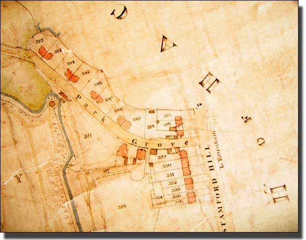 This detail shows that this part of the land, which was on Stoke Newington High Street and therefore easy to reach, was developed well before 1848. Park Grove acted as one entrance to the new Manor Road estate. As this was a Stoke Newington map, Stamford Hill is left blank. It was being developed, but had nothing to do with Stoke Newington tithes. At the same time (1846) a Parish Map was published