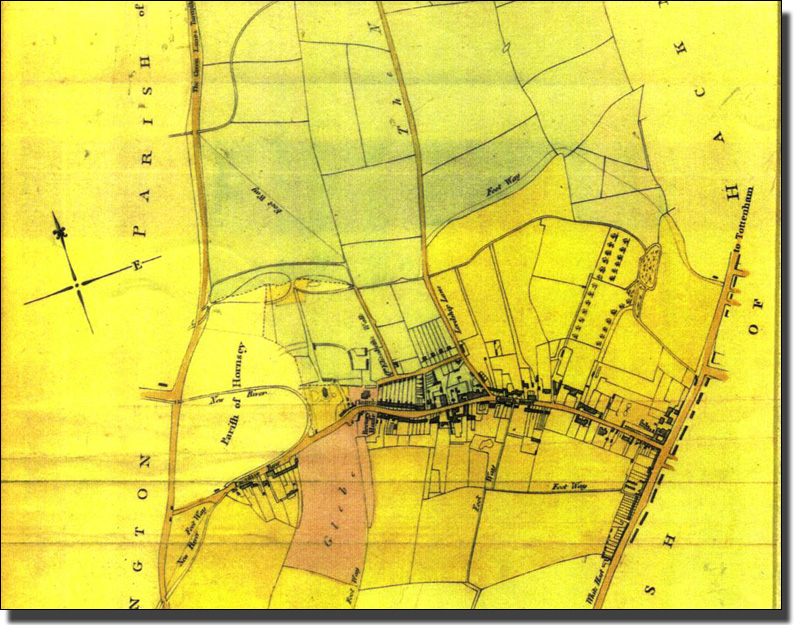 1814 Prebendal Map of Church Street and the South of Stoke Newington There were houses along the High Street, and others(not shown on this map) around Islington Green, but the rest was meadow land. The Two fields marked as Parish of Hornsey had been given to Hornsey many years earlier and were administered by that distant borough until 1900.