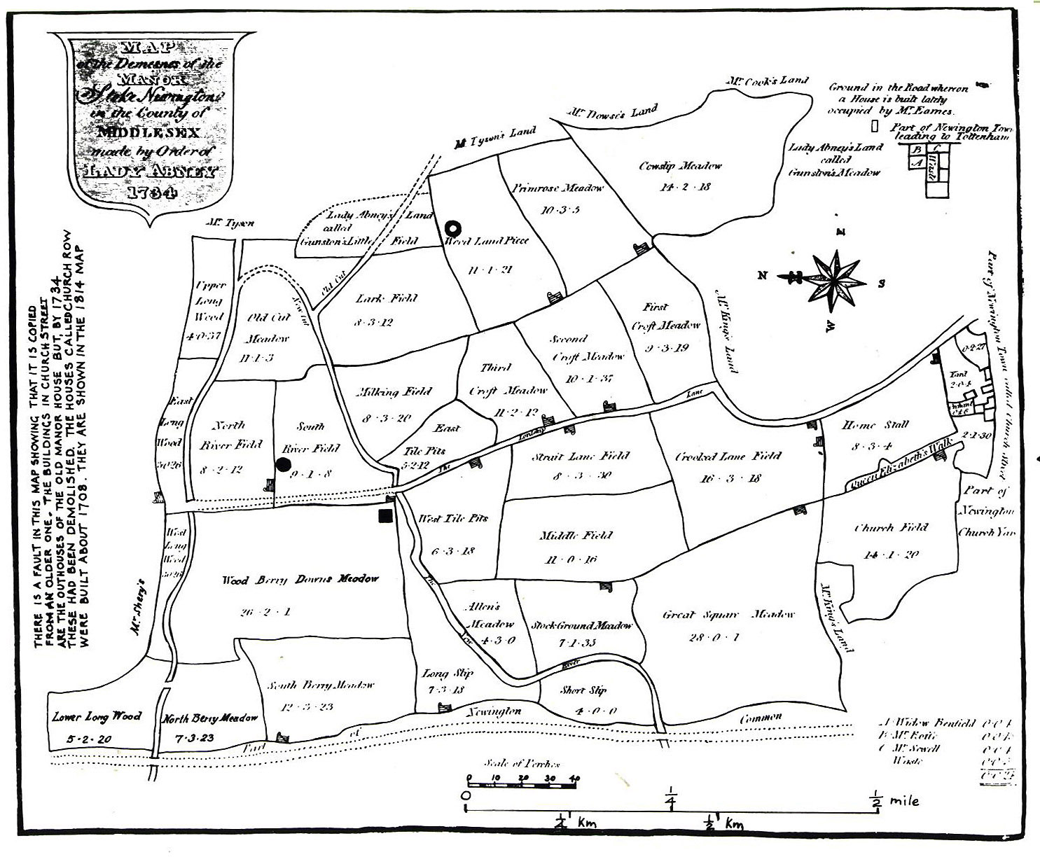 The 1734 Lady Abney Estate Map of Stoke Newington(Remember the north is to the left) This map takes us right back to a peasant Stoke Newington unchanged for years. Look at the field names. How often have the people living in theWoodberry Down flats which were built on Lark Field, heard a lark in the garden. The country field names come from a completely different world. There is a mistake on this map showing that it was copied from an earlier one. The buildings shown on this map in Stoke Newington Church Street, are the outhouses of the old Manor House but, by 1734, these had been demolished. The houses called Church Row, which replaced the Manor House, were built before this map and are on the 1814 one. |